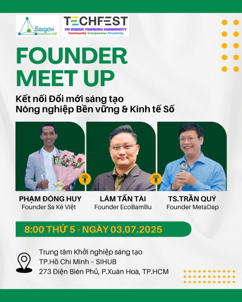 Sự kiện Founder Meet Up hướng tới nông nghiệp xanh, ứng dụng công nghệ, phát triển bền vững, tài sản số. Founder Meet Up tổ chức vào sáng ngày Thứ năm, 03/07/2025 tại SIHUB, với sự tham gia của cộng đồng startup, doanh nghiệp và nhà đầu tư quan tâm …
